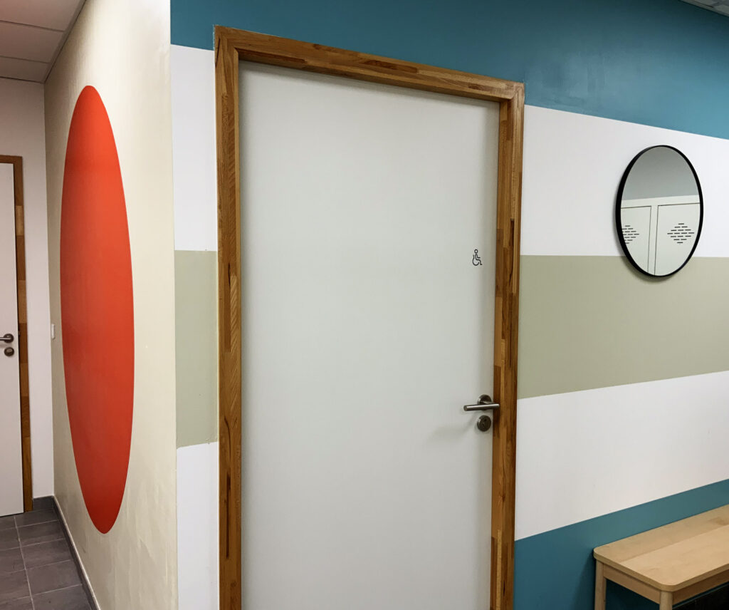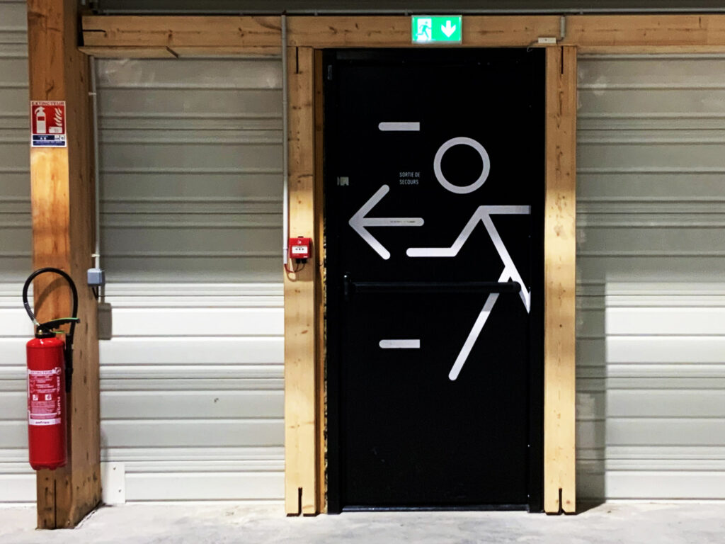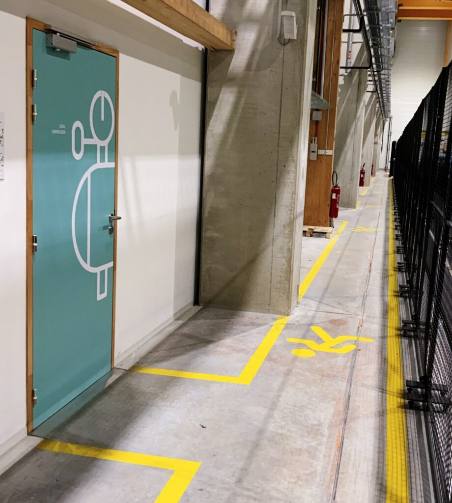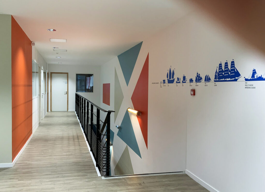 La signalétique ne sert pas seulement à s’orienter : elle accompagne aussi le travail quotidien, en faisant écho aux différentes phases de fabrication des mâts et des grandes pièces composites.